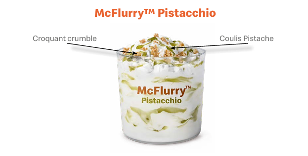 DĂ©couvrez le McFlurryâą Pistacchio, avec sa glace vanille, ses croquants crumble et son coulis de pistache… Un mĂ©lange de saveur et de texture pour un rĂ©sultat parfait ! đâ
