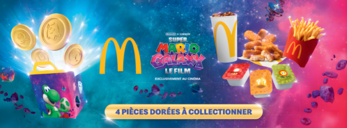 Durée limitée. Sauces Power-Up = sauces spéciales. Infinity Stars = étoiles panées au cheddar. Les Infinity Stars ne sont pas disponibles en menu et ne sont pas proposées dans les restaurants Originals. Voir liste des restaurants Originals sur www.mcdonalds.fr. 1 pièce dorée distribuée aléatoirement parmi 4 modèles pour tout achat d’un Menu Best Of™ ou Maxi Best Of™ « Super Mario Galaxy Le Film ». Jeu avec obligation d’achat. Voir dates, modalités de participation, produits éligibles et détails des dotations dans le règlement complet disponible sur www.mcdonalds.fr. La pièce dorée ne peut pas être vendue seule. Les sauces ne peuvent pas être vendues séparément. Les menus avec pièce ne sont pas disponibles en livraison via partenaires. Un jouet ou un livre par Happy Meal™. © 2026 McDonald’s. © Nintendo et Universal City Studios LLC. Tous droits réservés. © Nintendo. Les marques de Nintendo sont la propriété de Nintendo. Les éléments Universal et tous les indices associés TM & © 2026 Universal Studios. Tous droits réservés. Un jouet ou un livre par Happy Meal™. © 2026 McDonald’s. © Nintendo et Universal City Studios LLC. Tous droits réservés.
